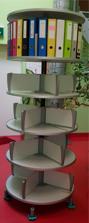 Carrousel à classeur. 5 niveaux + plateau supérieur. Diamètre 80cm Hauteur 195cm. 140 classeurs de 7cm ou 180 classeurs de 5cm. Chaque plateau tourne individuellement. Très bon état. Sans garantie. Prix 325.-- CHF à prendre sur place. Prix neuf 875.-- CHF. manutan.ch |